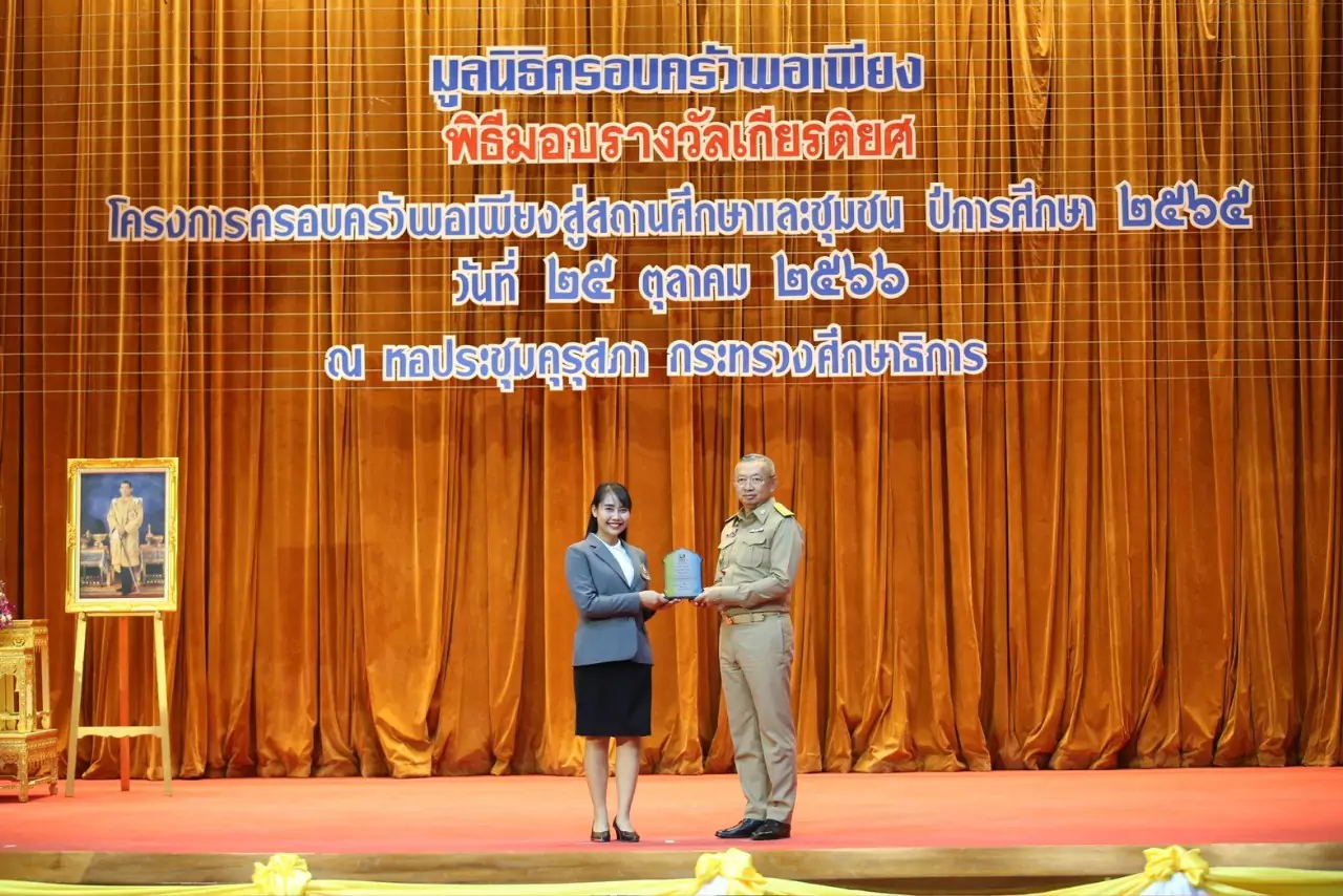 โอกาสนี้ รมว.ศธ. ได้มอบรางวัลเกียรติยศ โครงการครอบครัวพอเพียงสู่สถานศึกษาและชุมชน ประจำปีการศึกษา 2566 แก่สถานศึกษา 126 แห่ง ประกอบด้วย รางวัลเชิดชูเกียรติองค์กรภาคีเครือข่ายดีเด่น, รางวัลศูนย์ครอบครัวพอเพียงต้นแบบการบูรณาการอย่างเป็นรูปธรรมดีเยี่ยม, รางวัลผู้บริหารสถานศึกษาตามศาสตร์ของพระราชา, รางวัลครูดีศรีแผ่นดิน, รางวัลขับเคลื่อนศูนย์ครอบครัวพอเพียง และ รางวัล Volunteer Star พร้อมเยี่ยมชมบูธนิทรรศการนำเสนอผลงานฯ ของโรงเรียนต่าง ๆ ได้แก่ ศูนย์ครอบครัวพอเพียงโรงเรียนสภาราชินี จังหวัดตรัง ศูนย์ครอบครัวพอเพียงโรงเรียนราชประชานุเคราะห์ 48 จังหวัดจันทบุรี ศูนย์ครอบครัวพอเพียงโรงเรียนเบญจมราชาลัยฯ กรุงเทพมหานคร ศูนย์ครอบครัวพอเพียงโรงเรียนปัว จังหวัดน่าน และศูนย์ครอบครัวพอเพียงโรงเรียนคำแสนวิทยาสรรค์ จังหวัดหนองบัวลำภู