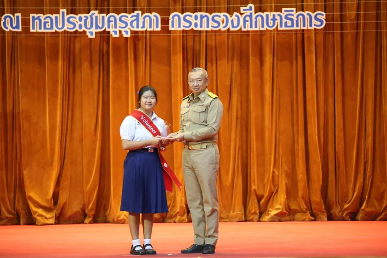 “วันนี้มีความตั้งใจมามอบรางวัลให้กับทุกท่านด้วยความสุข พร้อมขอชื่นชมนักเรียน ครู บุคลากรทางการศึกษา และสถานศึกษาทุกแห่ง ที่ได้รับรางวัลจากการทำความดี ทำสิ่งที่ดี ซึ่งการทำความดีเป็นเหมือนการปิดทองหลังพระ ตรงกับแนวทางที่รัฐมนตรียึดถือตลอดการทำงานรับราชการ เพราะเมื่อเราทำดี เราก็จะเกิดความสุขใจ แต่ในปัจจุบันการปิดทองหลังพระอย่างเดียวคงไม่พอ เพราะคนอื่นจะไม่ได้เห็นเป็นแบบอย่าง จึงจำเป็นต้องมีรางวัลเพื่อเป็นกำลังใจให้กับผู้ทำความดี และขอให้ทำความดีต่อไป พร้อมเก็บเกี่ยวความประทับใจในการรับรางวัลครั้งนี้ ไปถ่ายทอดให้กับเพื่อนนักเรียนและเพื่อนครู รวมทั้งบุคคลที่ใกล้ชิด ให้ได้ภาคภูมิใจร่วมกัน และเพื่อสร้างแรงบันดาลใจให้ผู้อื่นได้ตามต่อไป