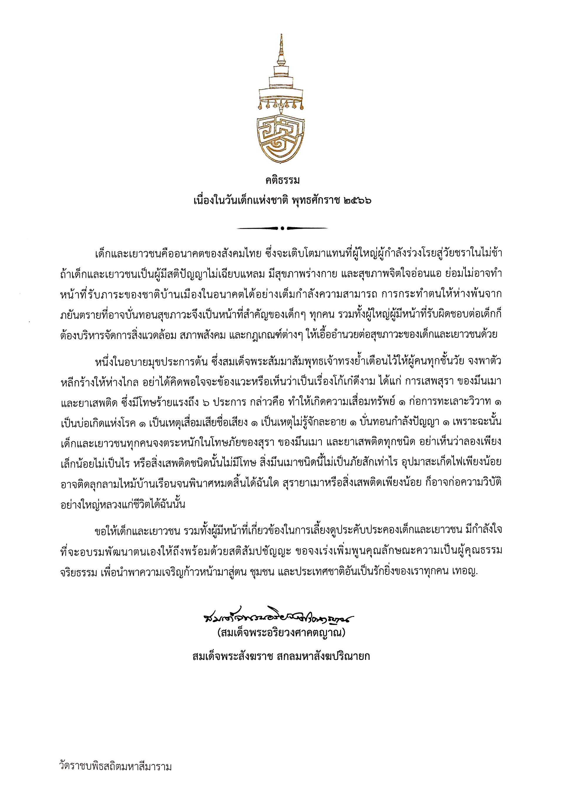 (2 มกราคม 2566) สมเด็จพระอริยวงศาคตญาณ สมเด็จพระสังฆราช สกลมหาสังฆปริณายก ประทานพระคติธรรม เนื่องในวันเด็กแห่งชาติ พุทธศักราช 2566 ความว่า