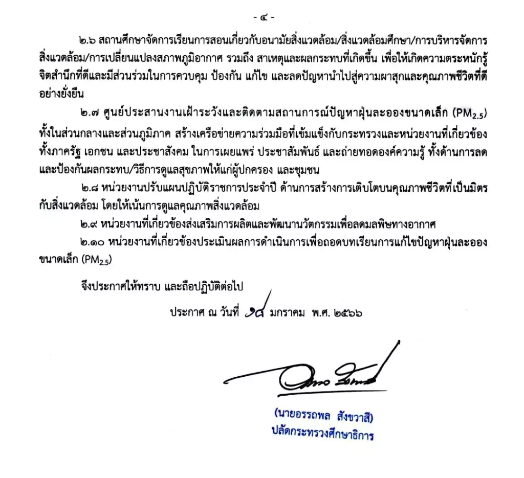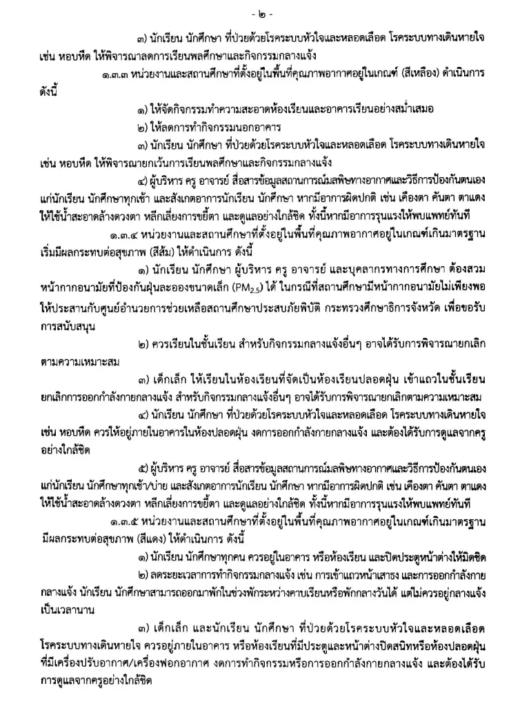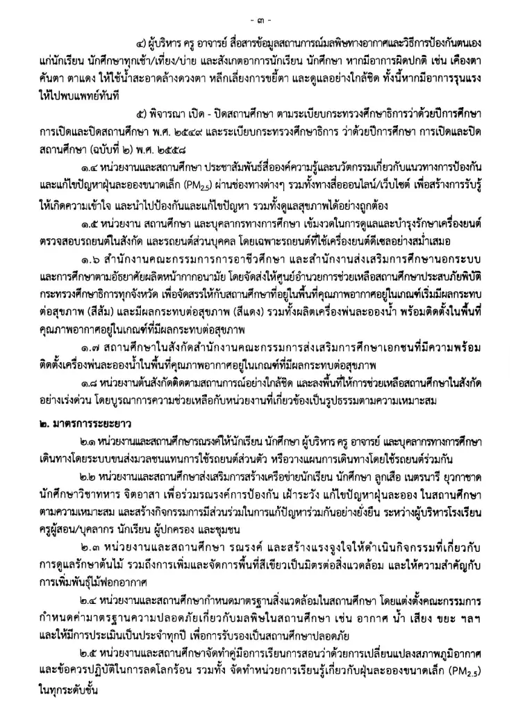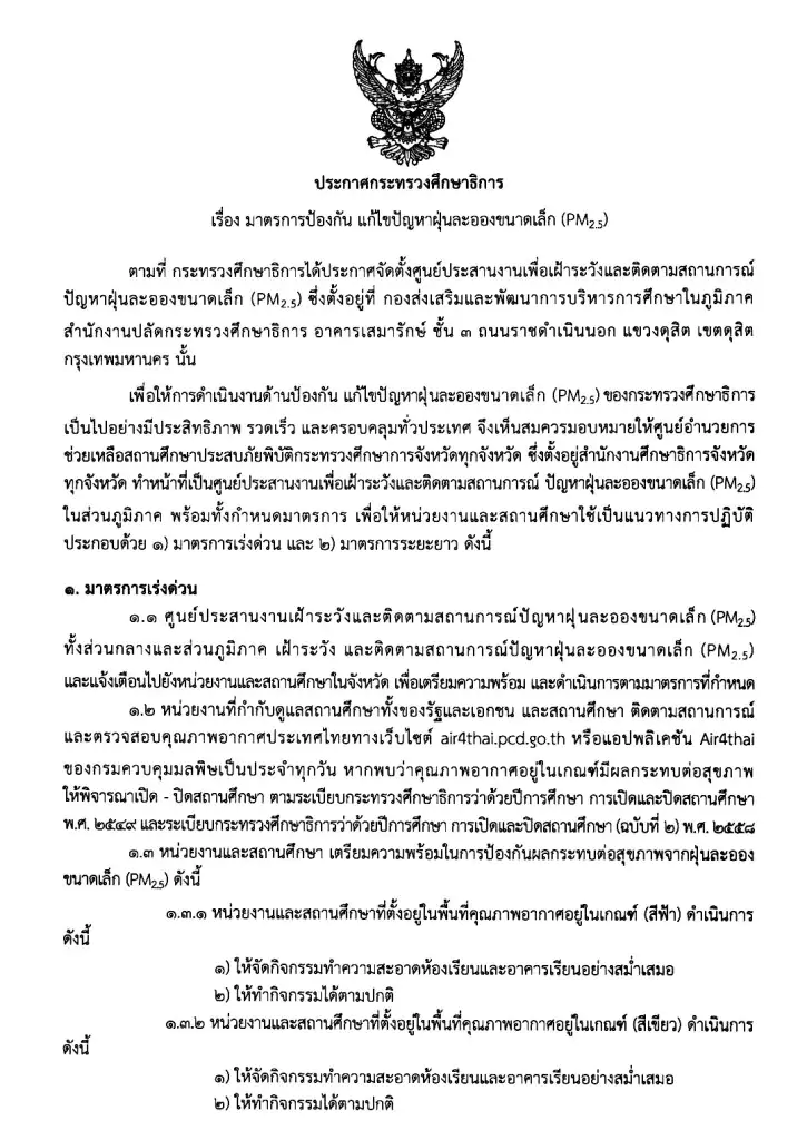 “สำหรับแนวปฏิบัติของโรงเรียนในสังกัด ศธ.ขอให้ผู้บริหารสถานศึกษาเฝ้าระวังสุขภาพนักเรียน ครู บุคลากรในสถานศึกษา ลดเวลาหรือหลีกเลี่ยงการทำกิจกรรมกลางแจ้ง ใช้อุปกรณ์ป้องกันตนเอง เช่น หน้ากากอนามัยที่กรอง PM2.5 ได้ หากมีอาการทางสุขภาพควรปรึกษาแพทย์ พร้อมเน้นย้ำให้ถือปฏิบัติตามประกาศกระทรวงศึกษาธิการ เรื่อง มาตรการป้องกัน แก้ไขปัญหาฝุ่นละอองขนาดเล็ก PM2.5 อย่างเคร่งครัด”
