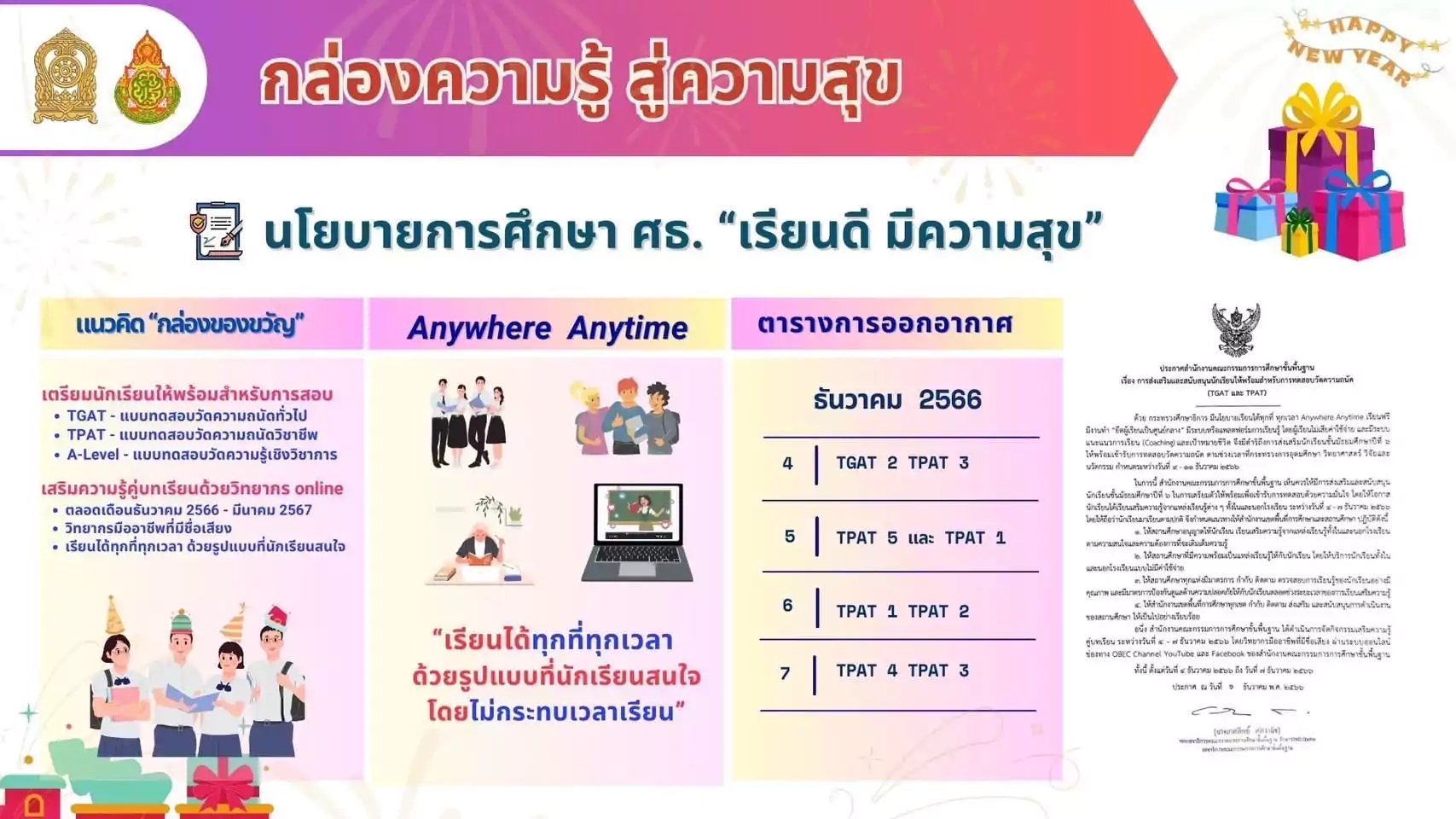 ในขณะเดียวกัน สพฐ.ยังได้จัดกิจกรรมส่งเสริมและสนับสนุนนักเรียนให้มีความพร้อมสำหรับการทดสอบวัดความถนัด (TGAT-TPAT) “กล่องความรู้ สู่ความสุข” ระหว่างวันที่ 4-7 ธันวาคม 2566 จัดสอนเสริมโดยเชิญครูและอาจารย์ที่มีชื่อเสียง มาให้ความรู้ผ่านระบบออนไลน์ เพื่อสร้างโอกาสแก่นักเรียนทุกคน ตามนโยบายเรียนดีมีความสุข เรียนได้ทุกที่ทุกเวลา Anywhere Anytime ในช่องทาง OBEC Chanel, Youtube และ Facebook ของ สพฐ.โดยไม่มีค่าใช้จ่าย เพิ่อช่วยลดภาระผู้ปกครองด้วย” ผู้ช่วยรัฐมนตรีฯ กล่าว